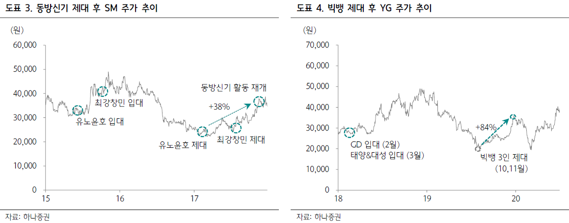 - 과거에도 메가 아티스트 활동 재개 구간에 주가 재평가가 반복되었음(동방신기·빅뱅 사례)