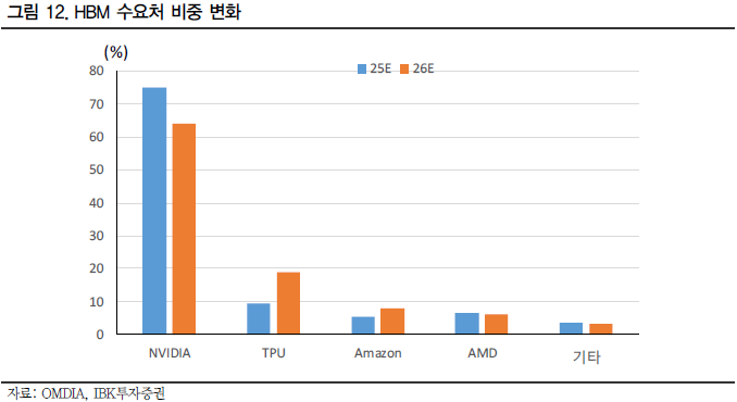- 2025년에는 미국의 엔비디아가 고대역폭 메모리 물량의 약 70퍼센트 이상을, 2026년에도 가장 큰 축을 담당하되 구글의 인공지능 가속기(테이퍼 유닛, Tensor Processing Unit) 등 주문형 집적회로(Application Specific Integrated Circuit)의 비중이 뚜렷이 커질 전망임.