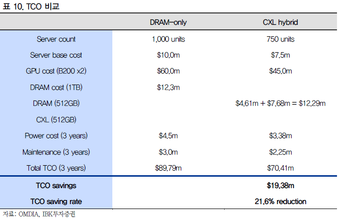 디램만으로 구성한 인공지능 서버 1,000대 대비, ‘컴퓨트 익스프레스 링크 하이브리드’ 750대로 구성 시 3년 총비용이 약 21.6퍼센트 낮아짐(89.79백만 달러 → 70.41백만 달러).