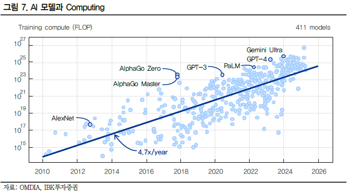 - 인공지능 모델은 매년 성능이 가파르게 상승했고, 2010년부터 2026년까지 계산량은 연평균 약 4.7배 증가하여 초거대 모델이 일상화됨.
