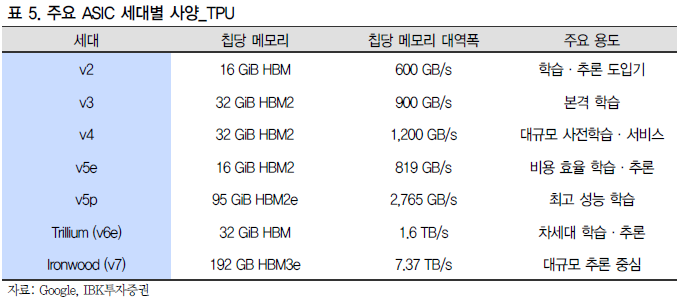 - 구글 테이퍼 유닛은 세대가 진화할수록 칩당 고대역폭 메모리 용량이 8기가바이트에서 192기가바이트로 커짐(세대별: v1 → v7).