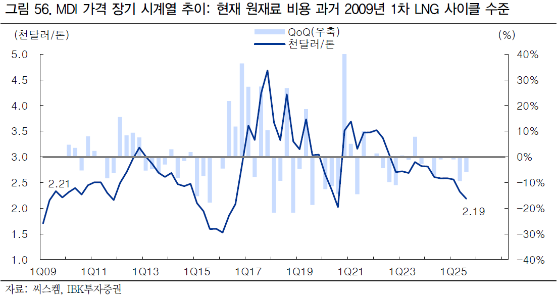 - 가격(P)은 고선가 계약 반영이 이제 본격화되고, 원가(C)의 핵심인 MDI(이소시아네이트) 하향 안정으로 마진 레버리지(수익 탄력)가 커짐