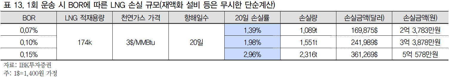 - 174K CBM, 가스가격 3$/MMBtu 가정 시 BOR 0.05%p 차이는 매 항차 약 1.7억원의 손실 격차를 만듦